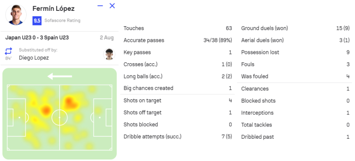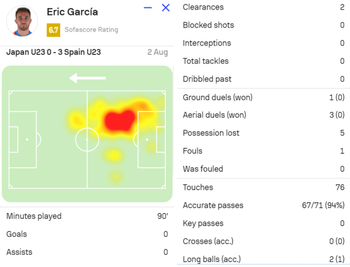 西班牙国奥在与日本国奥的比赛中以3-0获胜,整体表现给人留下深刻印象。球员加西亚在比赛中首发打满全场,虽然吃到一张黄牌,但他的传球成功率高达94%,为球队稳定的防守和进攻做出了贡献。